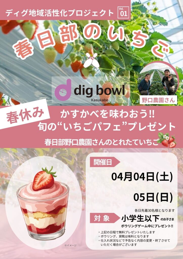 4月4日・5日各日先着30名様(小学生以下)の方にdigbowl特製いちごパフェをプレゼント♪
